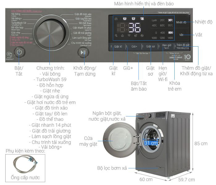 – Sản phẩm được tích hợp 14 chương trình hoạt động đa dạng: giặt tay + đồ len, vệ sinh lồng giặt, đồ hỗn hợp, đồ thể thao, đồ tinh xảo, giặt ga giường,… (Xem thêm tại bảng TSKT). Trong đó có chu trình tải về giúp máy hoạt động theo chương trình mà bạn tải xuống trong điện thoại thông qua ứng dụng của hãng.