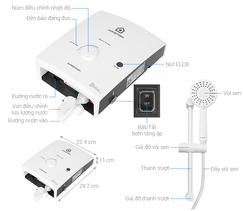 – Ariston 4500W AURES EASY 4.5P 3S có thiết kế hình vuông gọn nhẹ, tông màu trắng hiện đại thích hợp bố trí cho nhiều không gian phòng tắm khác nhau.