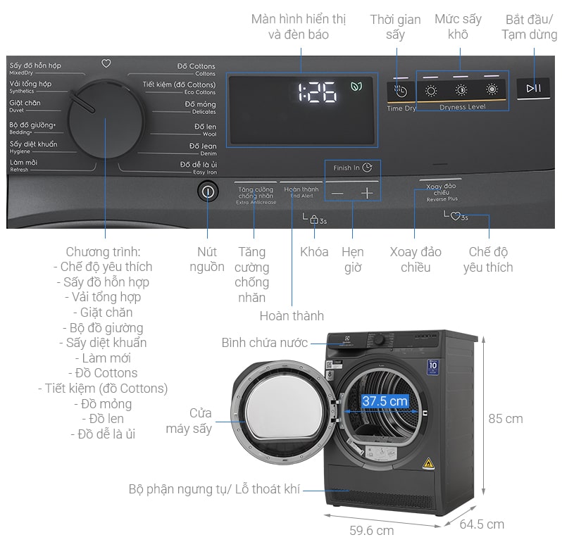 – Bên cạnh đó, sản phẩm còn tích hợp các tiện ích khác như: chuông báo lấy quần áo khi kết thúc, lưu chương trình yêu thích, tùy chỉnh thời gian và mức độ sấy… mang lại sự tiện nghi cho bạn khi sử dụng.