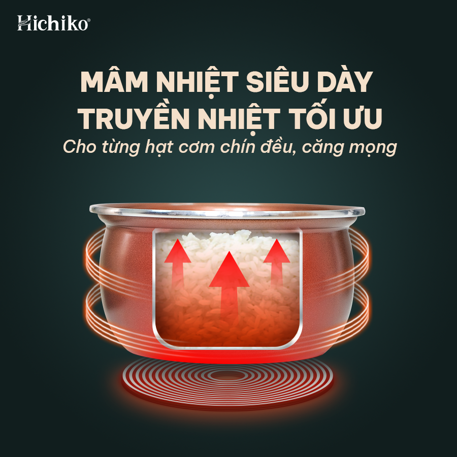Mâm nhiệt của Hichiko HC1202 được thiết kế siêu dày, giúp truyền nhiệt nhanh và đều hơn, đảm bảo từng hạt cơm được nấu chín kỹ, giữ nguyên độ dẻo thơm tự nhiên.