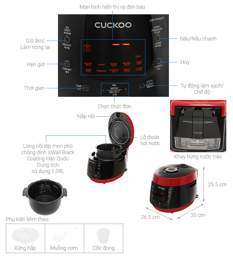 – Khay hứng nước trào có thể tháo rời, tiện vệ sinh nồi sau khi sử dụng.