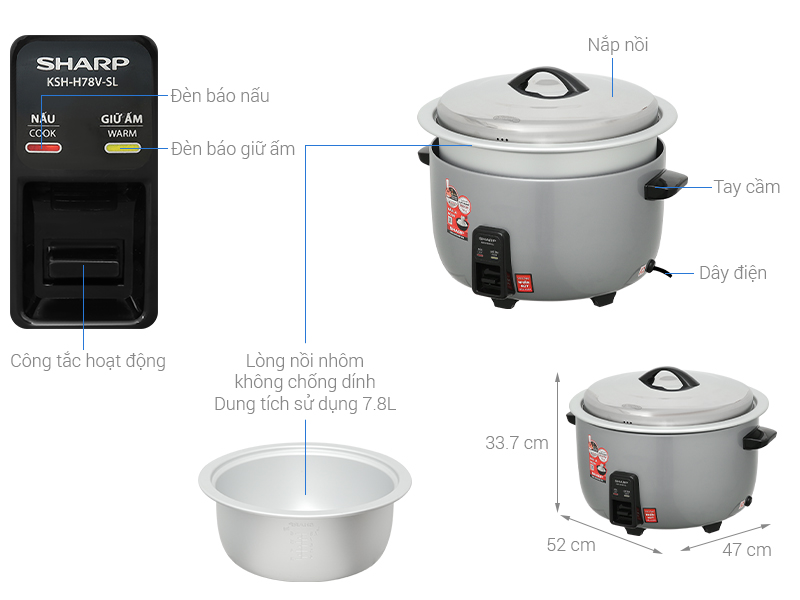 Đến từ thương hiệu Sharp đáng tin cậy, nồi cơm nắp rời Sharp 7.8 lít KSH-H78V-SL là một lựa chọn lý tưởng cho các nhà hàng, quán ăn,… cần một chiếc nồi cơm công nghiệp có khả năng nấu cơm nhanh, bền bỉ và dễ sử dụng.