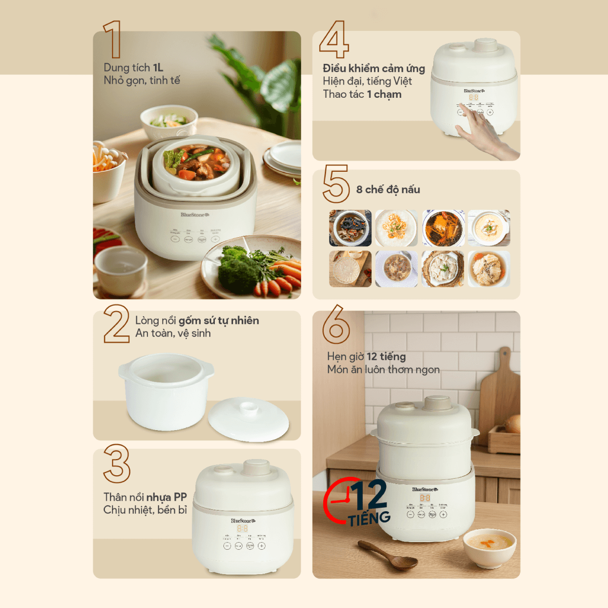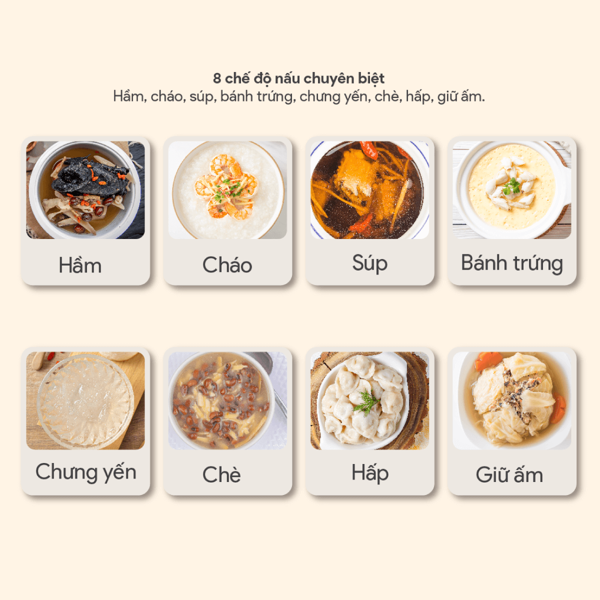 - Đa dạng chế độ nấu: 8 chế độ nấu chuyên biệt, bao gồm hầm, cháo, súp, bánh trứng, chưng yến, chè, hấp, và giữ ấm, đáp ứng nhiều nhu cầu khác nhau.