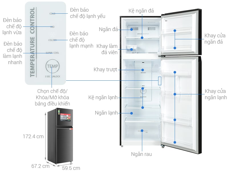 – Dung tích sử dụng 338 lít, mẫu tủ lạnh Toshiba này đáp ứng tốt nhu cầu bảo quản thực phẩm cho các gia đình từ 3 – 4 người.