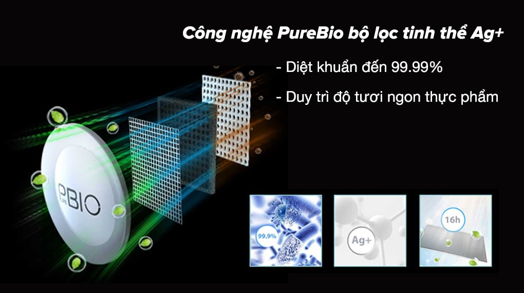 Công nghệ PureBio bộ lọc tinh thể Ag+: Bộ lọc được làm bằng chất liệu gốm sứ (ceramic) dạng hình tổ ong, rồi được nhúng vào tinh thể Bạc Ag+ và than hoạt tính. Nhờ đó, bộ lọc có khả năng diệt khuẩn đến 99.99% và khử mùi thực phẩm hiệu quả, góp phần kéo dài thời gian bảo quản thực phẩm lâu hơn.*Hình ảnh chỉ mang tính chất minh họa